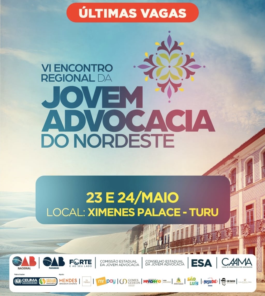 O VI Encontro Regional da Jovem Advocacia é um mega evento que reunirá mais de 120 palestrantes em dois dias. A estrutura é inovadora com cinco painéis Matraca, Beira-Mar, Cazumba, Rua do Giz e Espigão simultâneos em um mesmo ambiente. Os participantes utilizarão fones de ouvidos conectados ao rádio do palestrante, escutado a palestra escolhida no ato da inscrição. O evento acontecerá no Ximenes Palace, Turu, nos dias 23 e 24 de maio, reunindo participantes de todo o Nordeste.