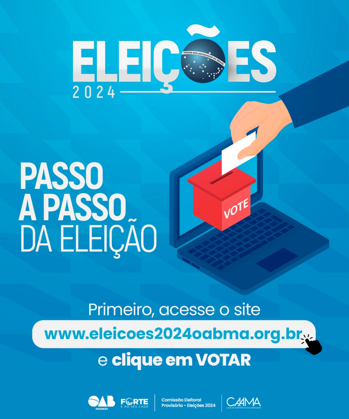 O voto deve ser registrado pela internet, por meio do site www.eleicoes2024oabma.org.br, acessível pelo, desktop ou laptop, independentemente da localização do eleitor. Ao acessar a plataforma pela web, o advogado(a) deve confirmar a sua identidade, o que pode ser feito por certificado digital em token, certificado em nuvem.