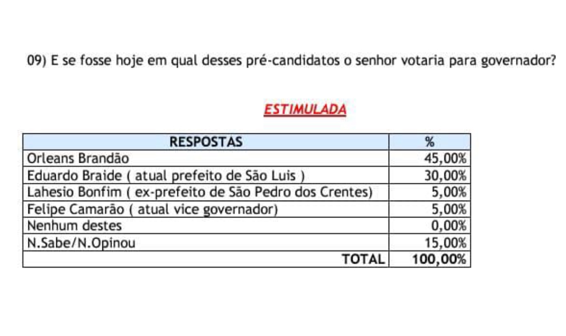 No cenário estimulado, o prefeito de São Luís, Eduardo Braide (PSD) é o segundo colocado, com 30%. Em seguida, o ex-prefeito de São Pedro dos Crentes, Lahesio Bonfim (Novo), e o vice-governador Felipe Camarão (PT) aparecem empatados, com 5% cada. Um total de 15% não soube ou não quis opinar.
