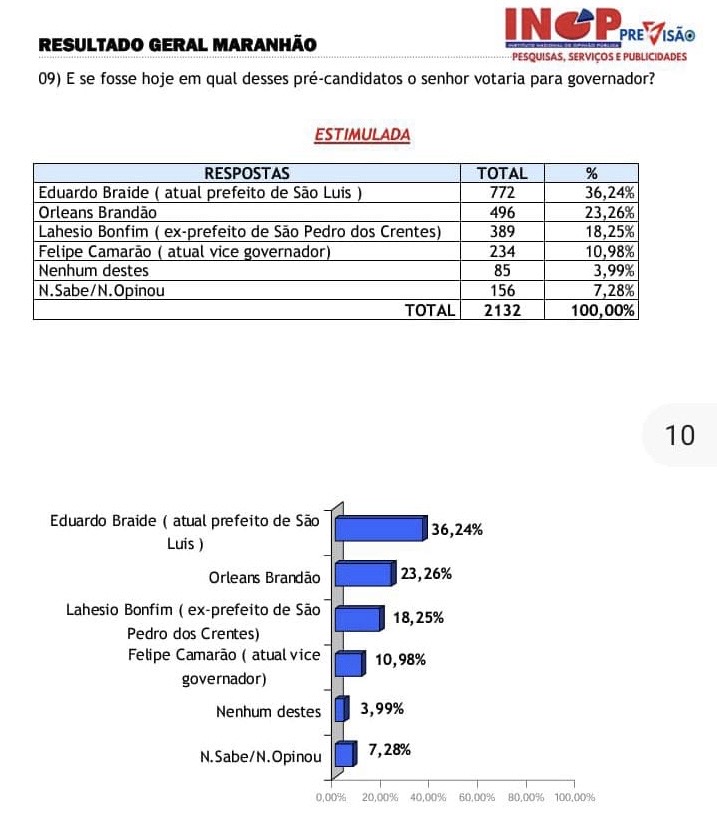 No levantamento, em cenário estimulado, o prefeito de São Luís, Eduardo Braide (PSD), aparece com 36,24%, seguido por Orleans com 23,26%. Os dados também mostram Lahesio Bonfim (Novo), ex-prefeito de São Pedro dos Crentes, com 18,25%, e o vice-governador Felipe Camarão (PT), com 10,98%. Além disso, 3,99% afirmaram que não votariam em nenhum dos pré-candidatos; e 7,28% não souberam ou não opinaram.