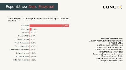 Uma nova pesquisa do Instituto Luneta movimentou o cenário político de São José de Ribamar no que diz respeito à disputa por uma das 42 vagas de deputado estadual. O levantamento, feito entre os dias 17 e 20 de novembro, ouviu 822 eleitores. A margem de erro é de 3,4 pontos percentuais, para mais ou para menos, e o nível de confiança é de 95%.