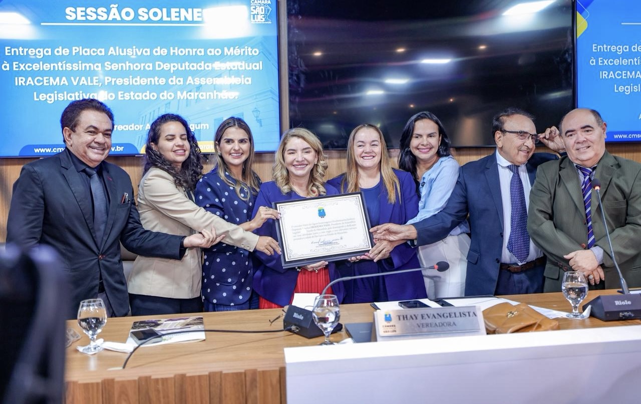 A presidente da Assembleia Legislativa do Maranhão, deputada Iracema Vale (PSB), foi homenageada, nesta segunda-feira (1º), com a Placa de Honra ao Mérito da Câmara Municipal de São Luís. A honraria, proposta pelo vereador Astro de Ogum (PCdoB) e aprovada por unanimidade pelo plenário, reconhece personalidades que se destacam pela dedicação ao serviço público e pelas relevantes contribuições ao município.