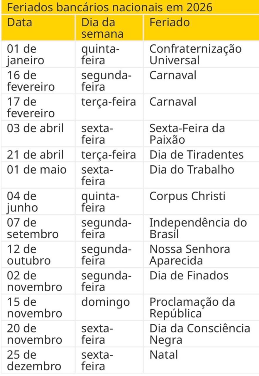 Entre os feriados nacionais que impactam o funcionamento dos bancos em 2026 estão o Carnaval (16 e 17 de fevereiro), Sexta-Feira da Paixão (3 de abril), Tiradentes (21 de abril), Dia do Trabalho (1º de maio), Corpus Christi (4 de junho), Independência do Brasil (7 de setembro), Nossa Senhora Aparecida (12 de outubro), Finados (2 de novembro), Consciência Negra (20 de novembro) e Natal (25 de dezembro). A Proclamação da República, em 15 de novembro, cairá em um domingo, dia em que já não há atendimento presencial.