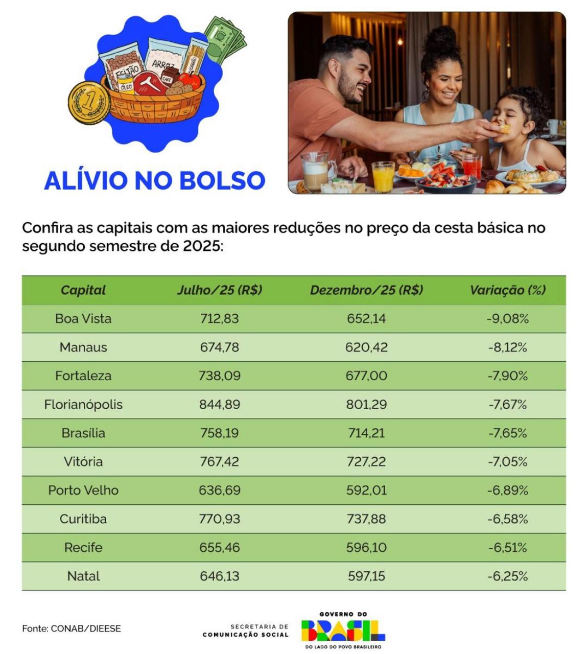 Regiões – Boa Vista lidera o cenário no Norte, assim como Fortaleza no Nordeste do país. Já no Centro-Oeste, Brasília é a recordista em declínio de preço da cesta, com variação de -7,65% nos últimos seis meses de 2025. No Sul, a capital mais bem colocada é Florianópolis, que teve redução de -7,67% no valor do conjunto de produtos. Por fim, Vitória (ES) é a capital vencedora no Sudeste do país, com redução de -7,05% no preço da cesta básica de alimentos no compilado das pesquisas da última metade do ano passado.