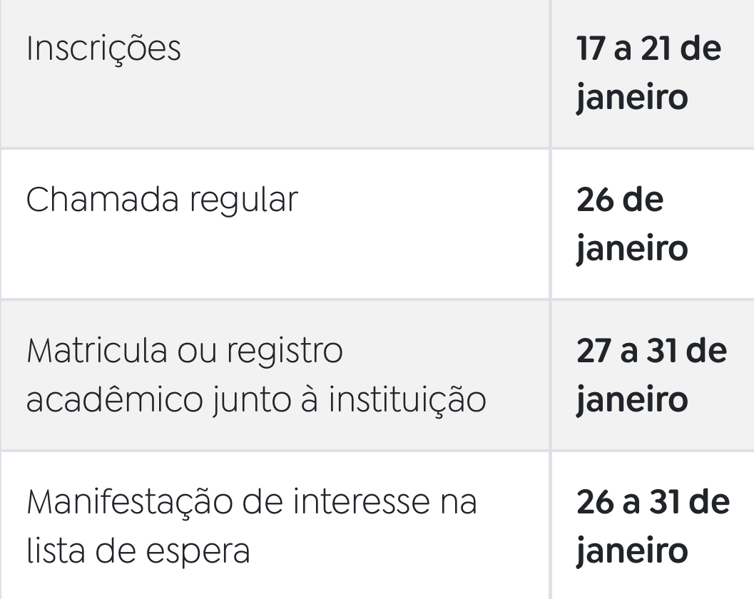 De acordo com o edital publicado pelo Ministério da Educação, o processo seletivo será constituído de uma única etapa. Os candidatos poderão se inscrever em até duas opções de vagas. O resultado da chamada regular será divulgado dia 26 de janeiro, no Portal Único de Acesso.