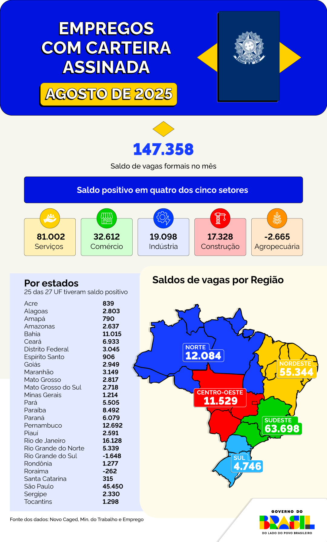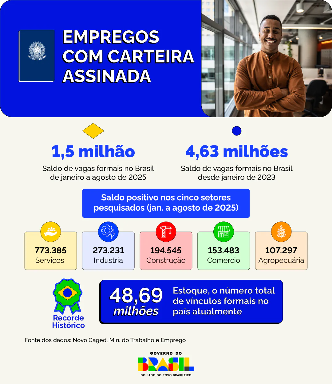 Nacional – O Brasil superou 1,5 milhão de novos empregos com carteira assinada nos oito primeiros meses de 2025. Entre janeiro e agosto, foram criados 1.501.930 vínculos formais, com saldo positivo nos cinco grandes grupamentos de atividades econômicas. O resultado eleva para 48,69 milhões o estoque de vínculos no país, um recorde absoluto. Desde o início da atual gestão do Governo do Brasil, em janeiro de 2023, o saldo é de 4,63 milhões de vagas com carteira assinada.