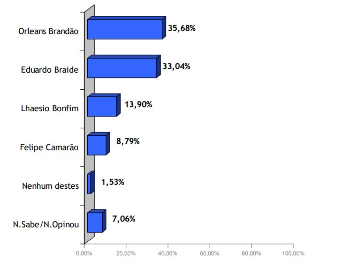 No levantamento estimulado, Brandão aparece com 35,68% das intenções de voto, seguido por Braide, que registra 33,04%. O ex-prefeito de São Pedro dos Crentes, Lahesio Bonfim (Novo), soma 13,90%, e o vice-governador Felipe Camarão (PT) marca 8,79%. Entre os entrevistados, 1,53% afirmaram não votar em nenhum dos nomes apresentados, enquanto 7,06% não souberam ou não responderam.