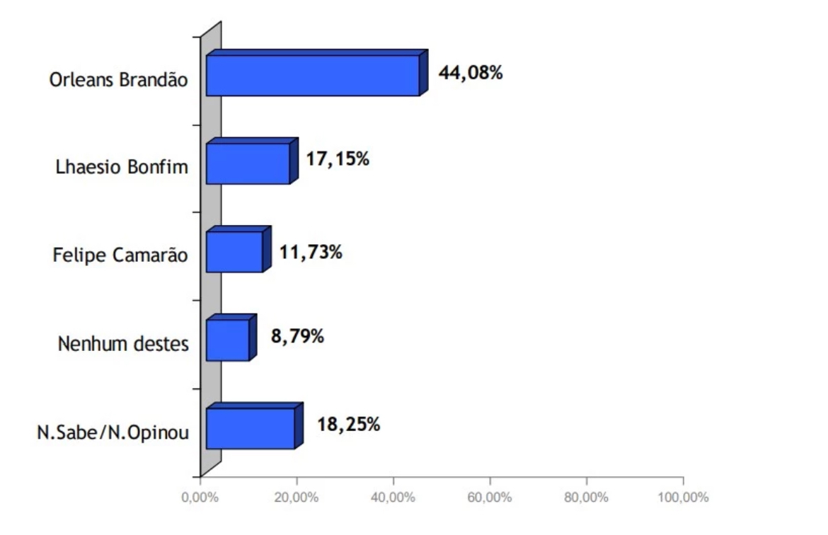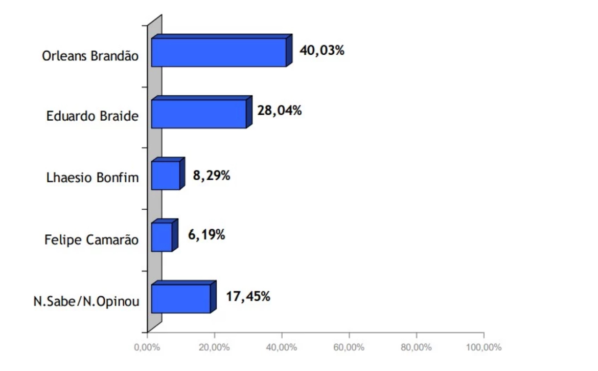 Em um cenário sem a participação de Braide, Orleans amplia a vantagem e atinge 44,08% da preferência do eleitorado. Lahesio aparece com 17,15% e Camarão com 11,73%. Neste caso, 8,79% disseram não optar por nenhum dos candidatos e 18,25% não souberam ou não responderam.